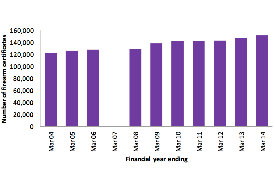 Number of firearm certificates; March 2004 122,100; March 2005 126,400; March 2006 127,900; March 2007 no figures available; March 2008 128,528; March 2009 138,728; March 2010 141,852; March 2011 141,840; March 2012 143,166; March 2013 147,695; March 2014
