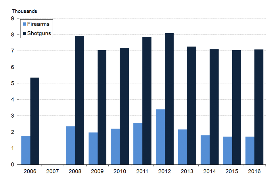 - there were 1,331,563 shotguns (covered by shotgun certificates) as at 31 March 2016; a decrease of 0.5% (-6,836) compared with the previous year.