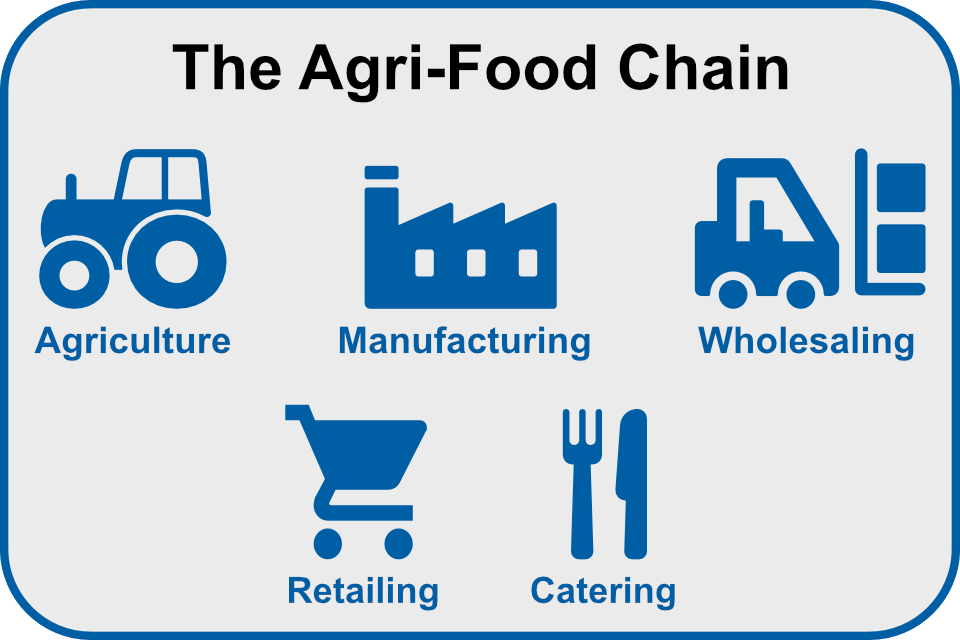 The Agri-food chain: image shows Agriculture, Manufacturing, Wholesaling, Retailing and Catering.