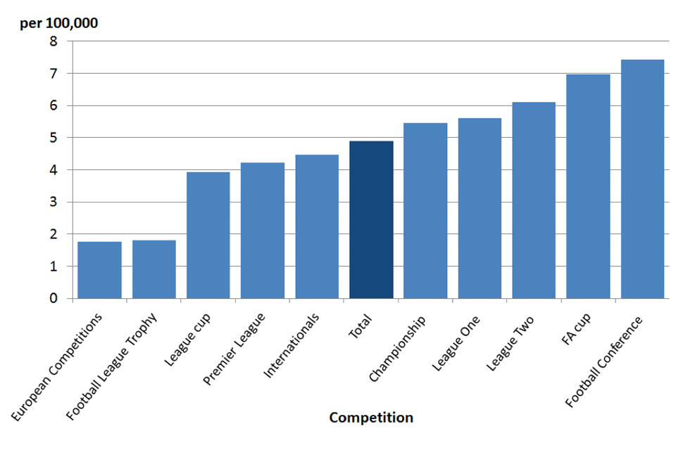 The football-related arrest rate in the 2014 to 2015 season was 4.9 arrests per 100,000 attendees. Although the Premier League accounted for the highest number of football-related arrests, it had an arrest rate of 4.2 arrests per 100,000 attendees. The Football Conference had the highest arrest rate of 7.4 arrests per 100,000 attendees whilst European competitions and the Football League Trophy both had the lowest arrest rate of 1.8 arrests per 100,000 attendees.