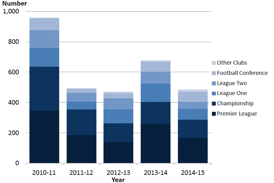 - ‘Other’ includes FA cup, League cup, Football League Trophy, European competitions, Internationals, Under-21 internationals, Pre-season friendlies, Community Shield and UEFA super cup.