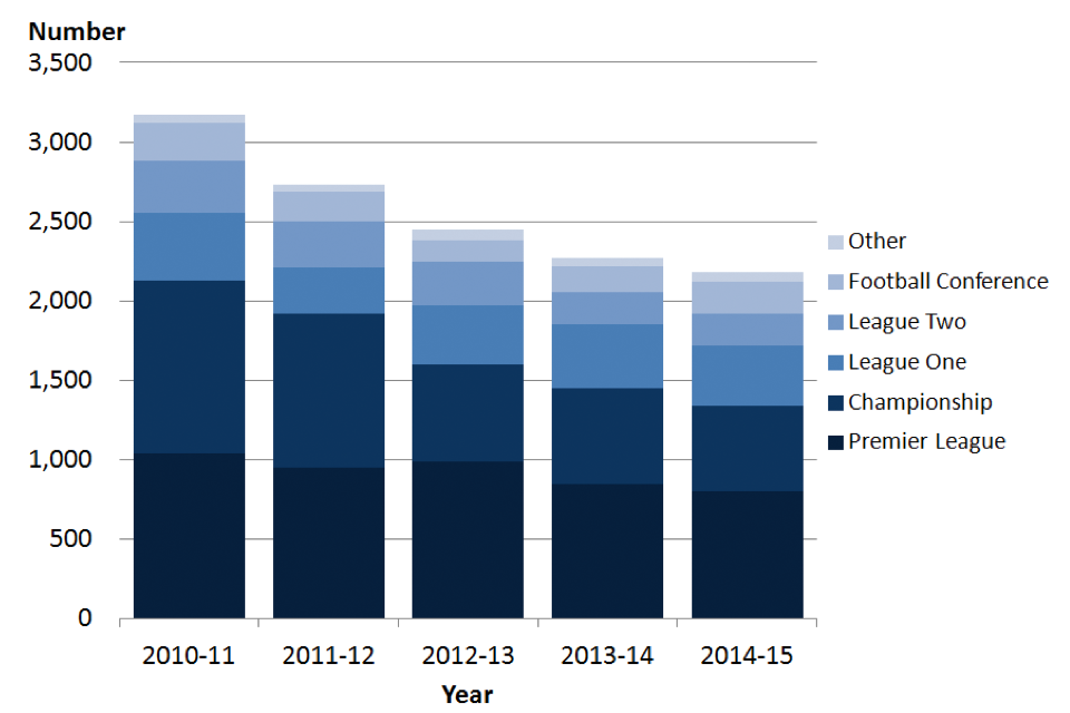 Figure 3 shows a steady decline in the number of football-related arrests over the last five seasons with the exception of the 2012 to 2013 season, where there was an increase of 4% (93) when compared with the previous season.