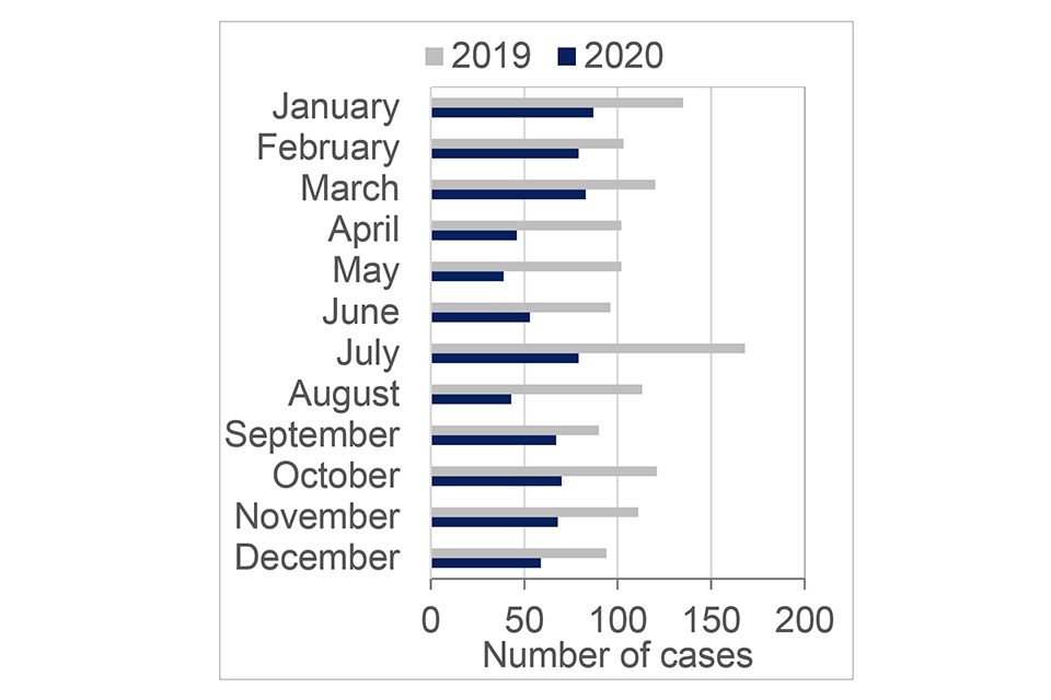 Table 2 and Chart 1 below show the monthly breakdown of cases referred to the FMU. The unit often experiences a spike in referrals around the school holidays, however in 2020 these peaks were more muted. This is thought to be largely attributed to the restrictions on domestic movement and overseas travel as a result of the coronavirus pandemic.