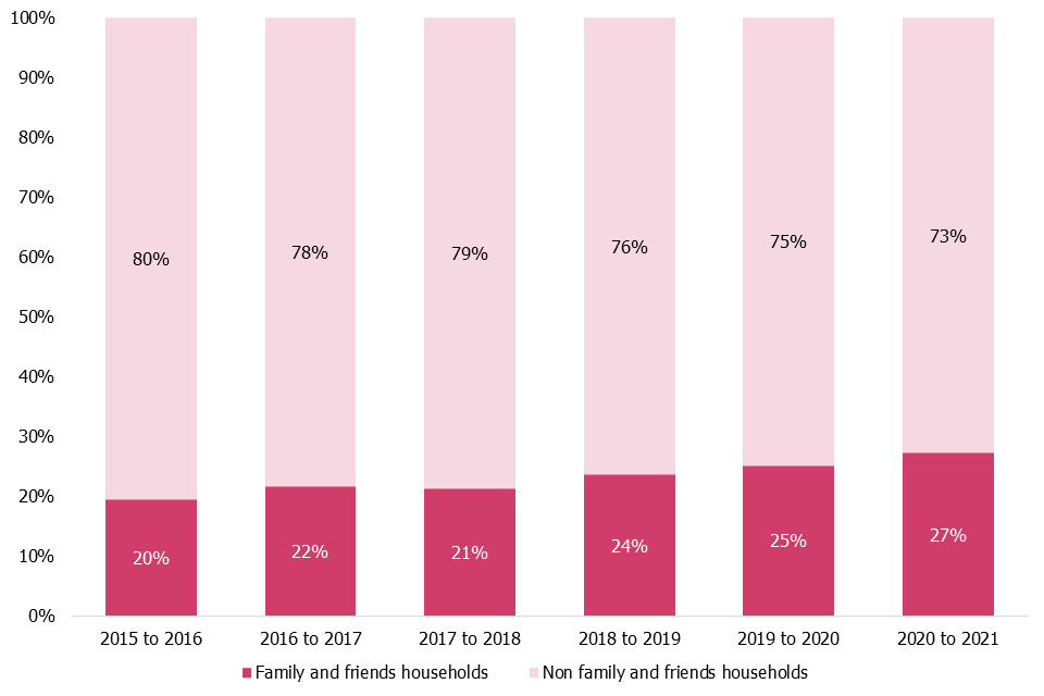 Family and friends households accounted for 58% of new approvals that were still active on 31 March 2021, and 62% of deregistrations in the LA sector.