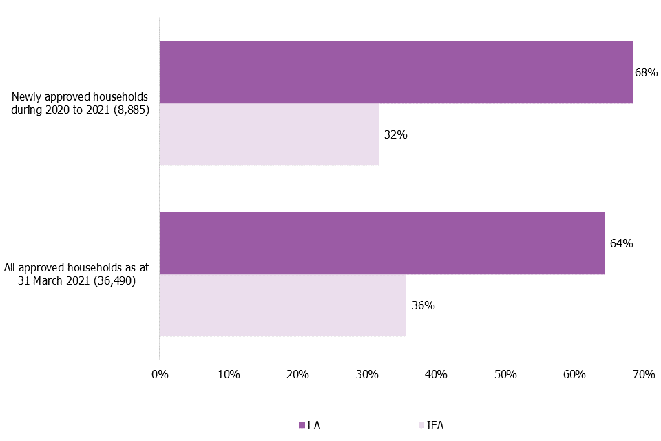 Of the 45,370 households, 8,880 were newly approved during 2020 to 2021 and still active at 31 March 2021. This marked a 12% increase in the number of newly approved households since 2014 to 2015. LAs accounted for just over two thirds of newly approved households (6,070 households or 68%), although 58% (3,525) of these new LA approvals were family and friends households