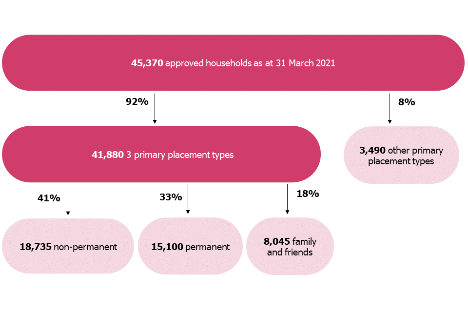 As at 31 March 2021, of the 45,370 approved households, 8,045 (18%) were family and friends households. These households had 12,750 foster carers, looking after 11,240 children.