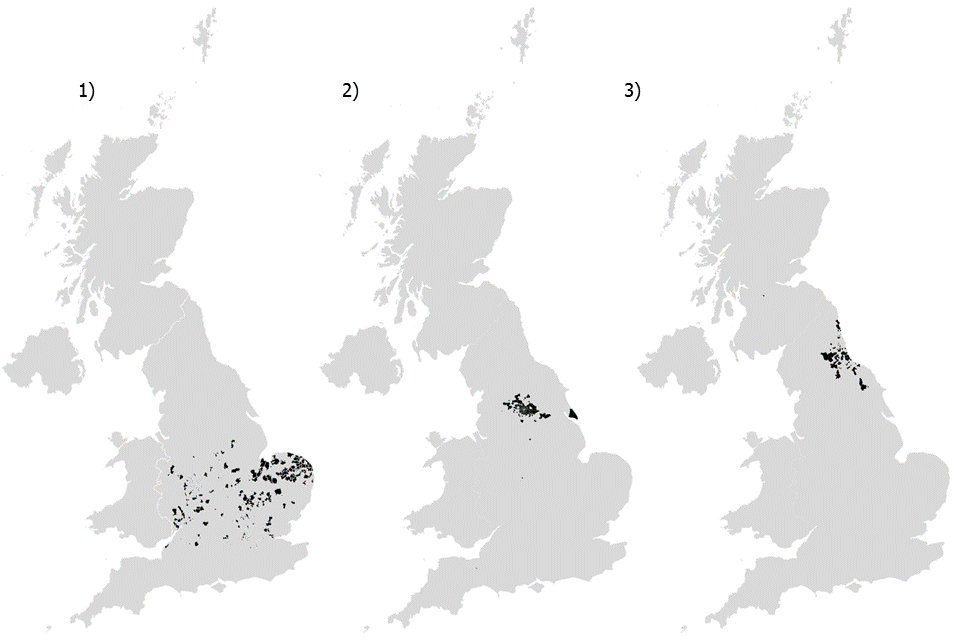 The postcode data will be used to better inform our inspection of fostering agencies. It also allows us to see for the first time the nature of the distribution of households for each agency. As can be seen in Figure 5, a large IFA (1) can have households spread over many areas of the country, in a number of regions. An LA, even a large one (2), tends to have carers more proximate to its boundary, while still having some carers at some distance from it. And a modestly sized IFA (3) may specialise regional recruitment in particular regions.