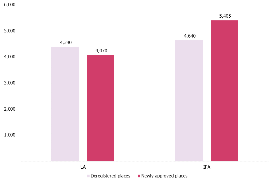 Recruitment and retention among IFA services has led to a net increase in capacity: 525 additional households and 765 additional places. In contrast, there has been a decrease in capacity of 35 households and 325 places in the LA sector. The large decrease in places compared with households was due to a high number of households approved for 3 or more places being deregistered, with new approvals of this type of home being much lower. Table 3 illustrates this further.