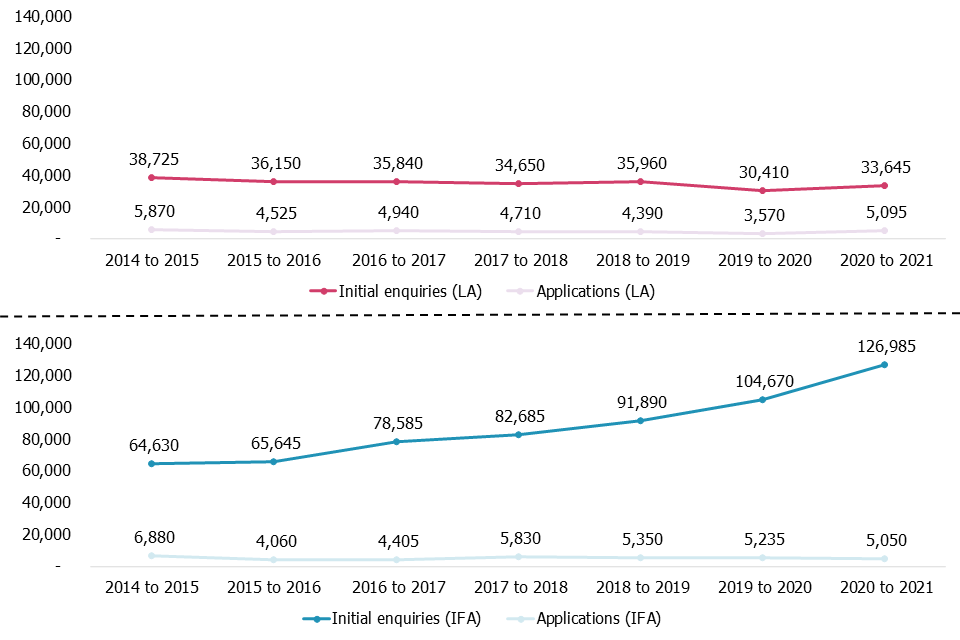 Although the majority of initial enquires (79%) came from the IFA sector, fewer of these IFA enquiries converted into applications. IFAs reported a ratio of 25:1 initial enquiries to applications, whereas LAs reported 7:1.