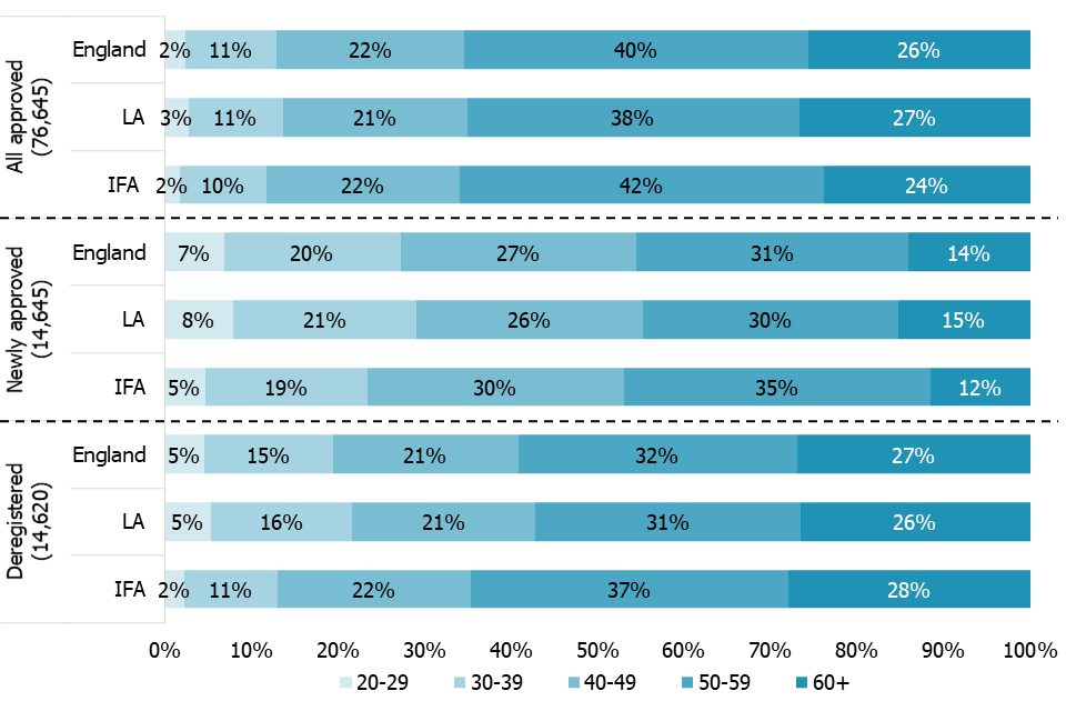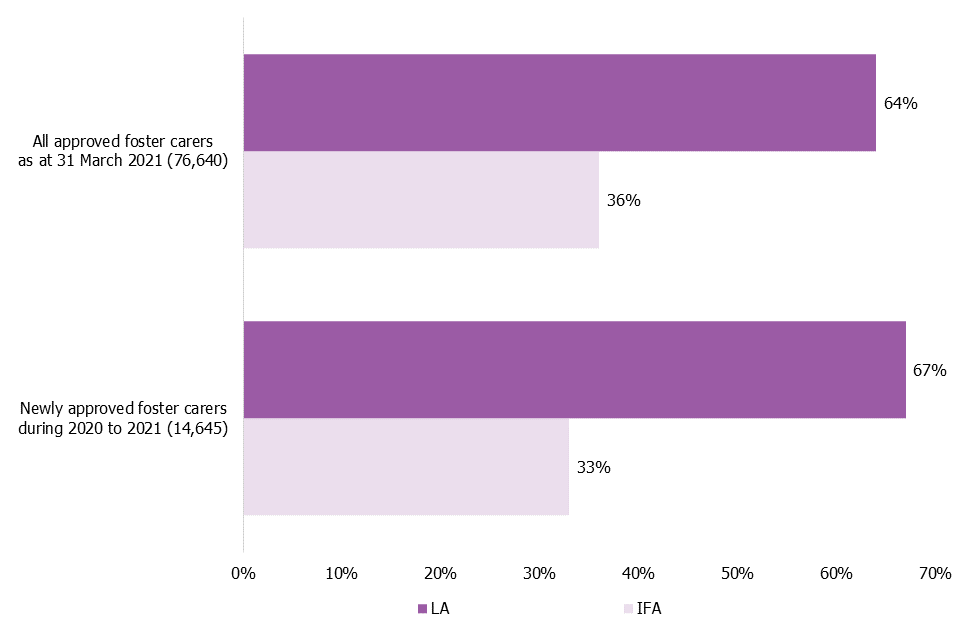 | All approved foster carers as at 31 March 2021 (76,640) | 49,420 | 27,220 | 64% | 36% |