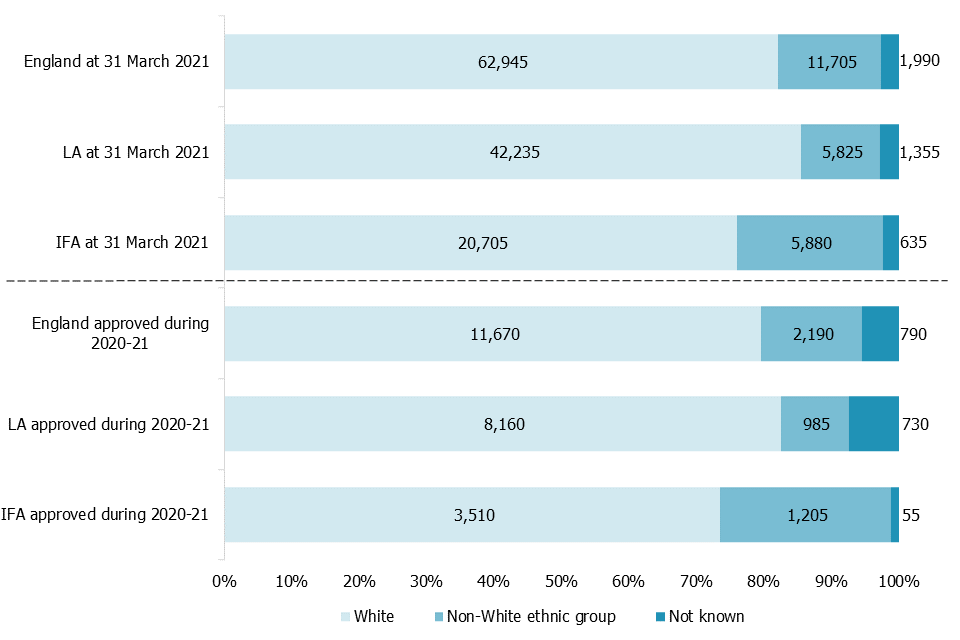 Data for Figure 12: Ethnicity of foster carers by sector, as at 31 March 2021 and approved during 2020 to 2021
