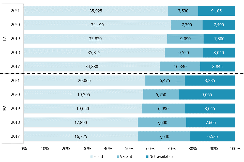Patterns of occupancy have stayed broadly the same over the last 7 years, with just under two thirds of places being filled. LAs continue to have higher proportions of filled places (68%) than IFAs (58%). However, this higher proportion of filled places in LAs is largely accounted for by family and friends carers, due to the nature of their approvals for a specific child.