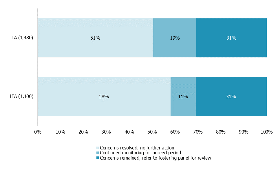 | Percentage concerns resolved, no further action | Percentage continued monitoring for agreed period | Percentage concerns remained, refer to fostering panel for review | |