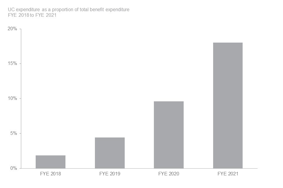 - The expenditure on UC more than doubled in FYE 2021 and accounts for 18% of all benefit expenditure