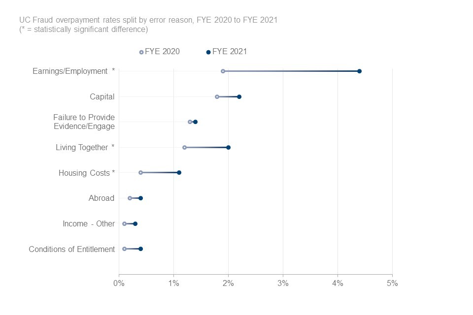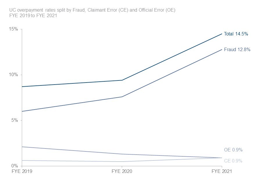 Just over half of the overall increase was due to the statistically significant increase in the UC overpayment rate, from 9.4% to 14.5%. Even if the overpayment rate for UC had remained at the same level as in FYE 2020, the overall overpayment rate across all benefits would still have risen to a level higher than ever reported (3.0%), due to the expenditure on UC more than doubling in the last year.