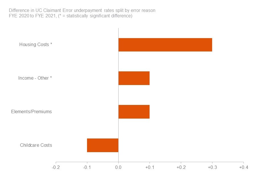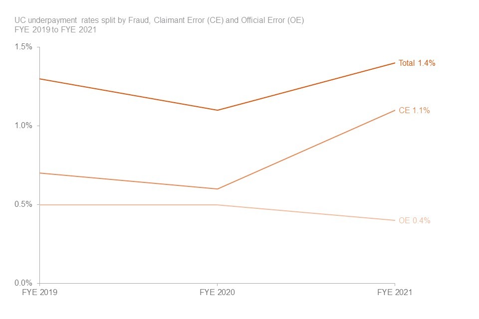 For example: The rate of Official Error overpayments on Universal Credit decreased from 1.3% to 0.9% between FYE 2020 and FYE 2021, but expenditure increased from £18.4bn to £38.2bn, which meant that the monetary value increased between the two years, from £250m to £330m.