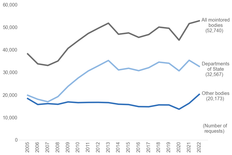 The majority (32,576) of these requests were at Departments of State, with the remaining 20,173 being received by other monitored bodies.