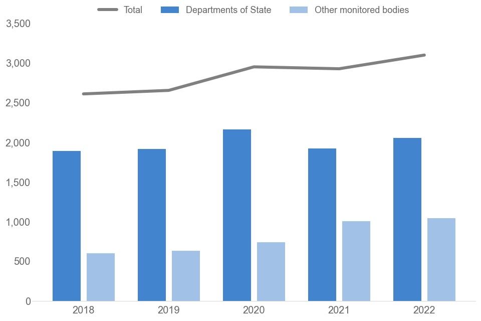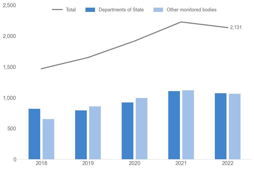 Monitored bodies review the figures provided in the quarterly monitoring, and may make internal revisions to the statistics after publication. The revised figures are then included in the annual end of year monitoring. As a result, the quarter to quarter statistics will not always sum to the annual figures. Where departments have made revisions to quarterly figures these will be noted in the statistical tables published in the annual report.