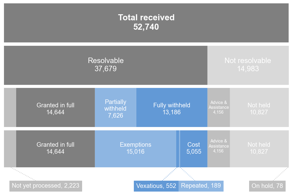 52,740 “non-routine”* requests were received in 2022. Of these, 37,679 (71%) were resolvable. Resolvable requests are those where it was possible to give a substantive decision on whether to release the requested information. Of these: