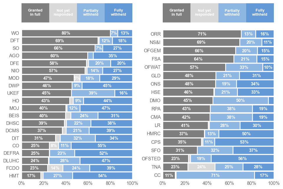 Stacked bar chart showing outcomes of FOI requests in 2022 by body