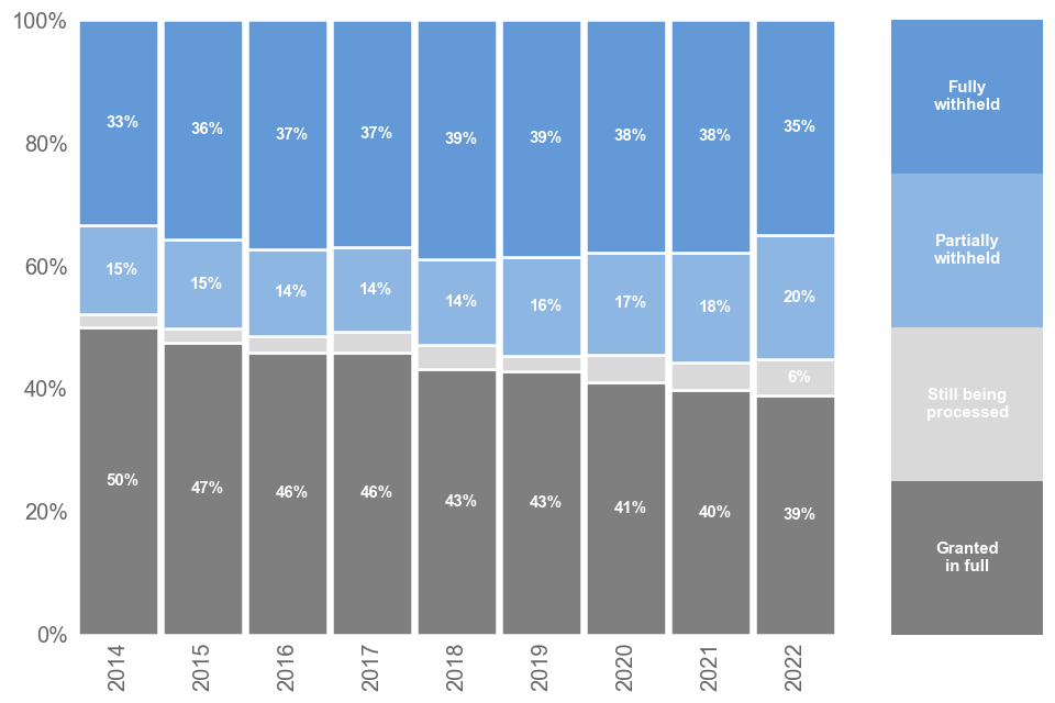 Of the 52,740 FOI requests received, 37,679 were resolvable. Of these, 39% were granted in full, down from 40% in 2021 and 35% were withheld in full, down from 38% in 2021. The remaining resolvable requests were not yet processed (6%) or were partially withheld (20%).