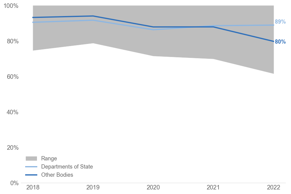 Across all Departments of State, 89% of requests were responded to in time, the same as in 2021.