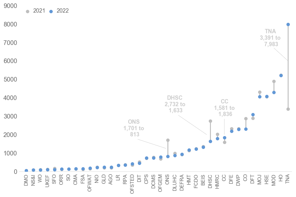 The National Archives had the largest increase in requests (+4,592) amongst all monitored bodies compared to 2021, followed by the Charity Commission (+255). The Department for Health and Social Care had the largest decrease in number of requests (-1,099) followed by the Office for National Statistics (-888).