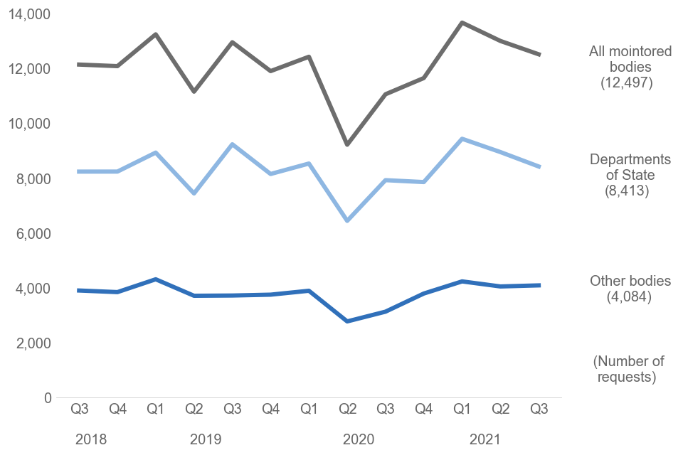 The majority (8,413) of these requests were at Departments of State, with the remaining 4,084 being received by other monitored bodies.