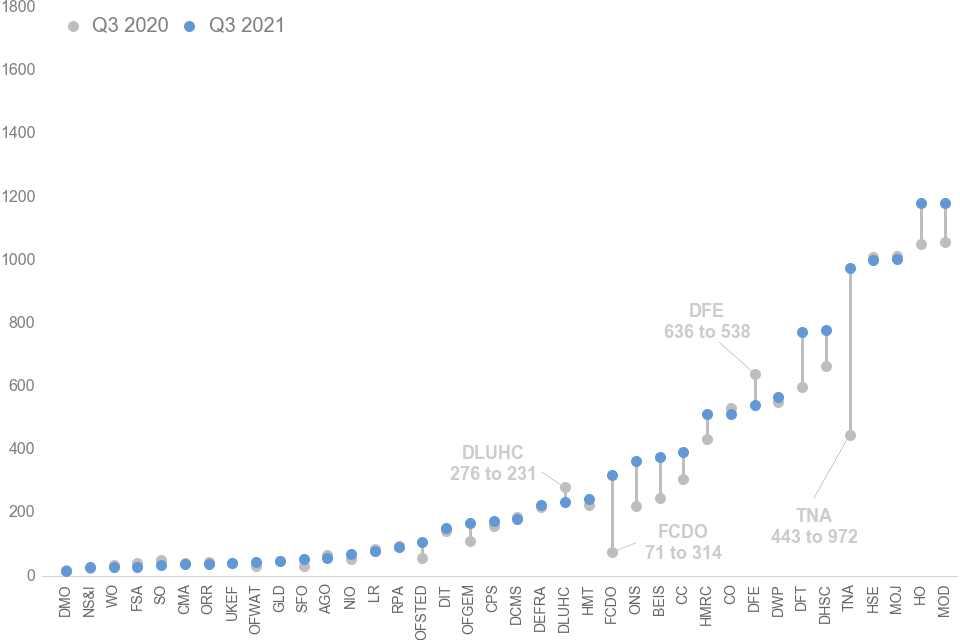 Chart comparing volume of FOI requests received by body in Q3 2020 to Q3 2021