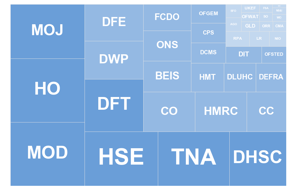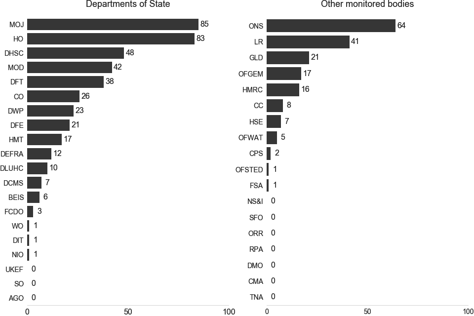 The Department for Health and Social Care, the Ministry of Defence, the Ministry of Justice, and the Home Office accounted for just under half (49%) of requests to Departments of State; while the Health and Safety Executive, National Archives and HM Revenue & Customs accounted for 61% of requests to other monitored bodies.