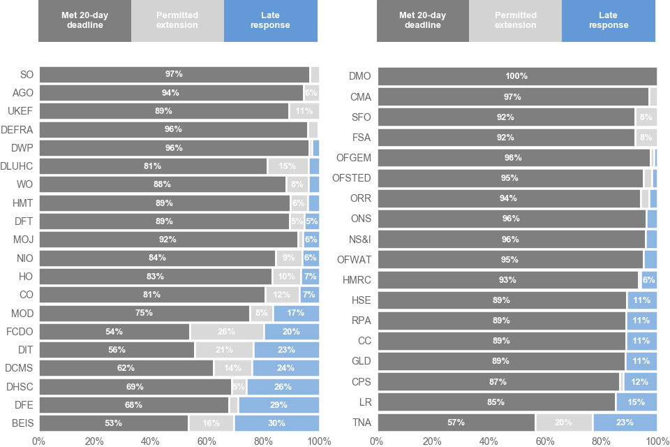 Horizontal stacked bar chart showing timeliness of response by body - grouped into Met 20 day deadline, Permitted extension and Late response