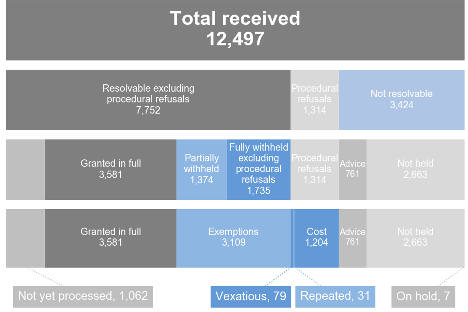 FOI requests that have been refused for being vexatious or repeated, along with those refused on cost grounds are treated and included in these statistics as resolvable requests that have been ‘fully-withheld’. These types of refusals are referred to as ‘procedural refusals’ in these statistics.