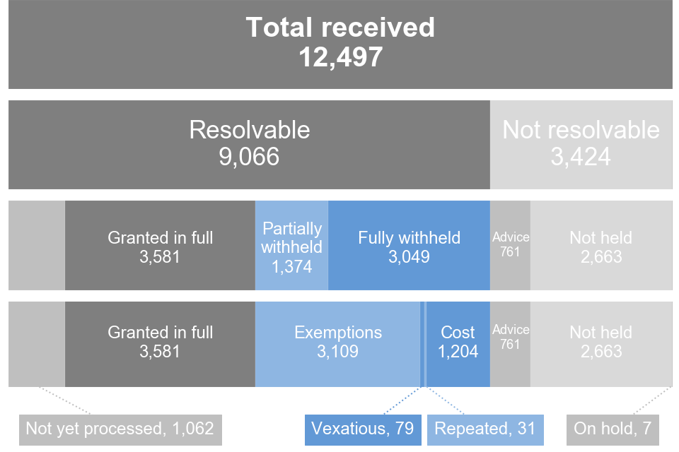 Of the 12,497 FOI requests received, 9,066 were resolvable. Of these, 39% were granted in full, down from 40% from the same period in 2020 and 34% were withheld in full, down from 35% from the same period in 2020. The remaining resolvable requests were not yet processed or were partially withheld.