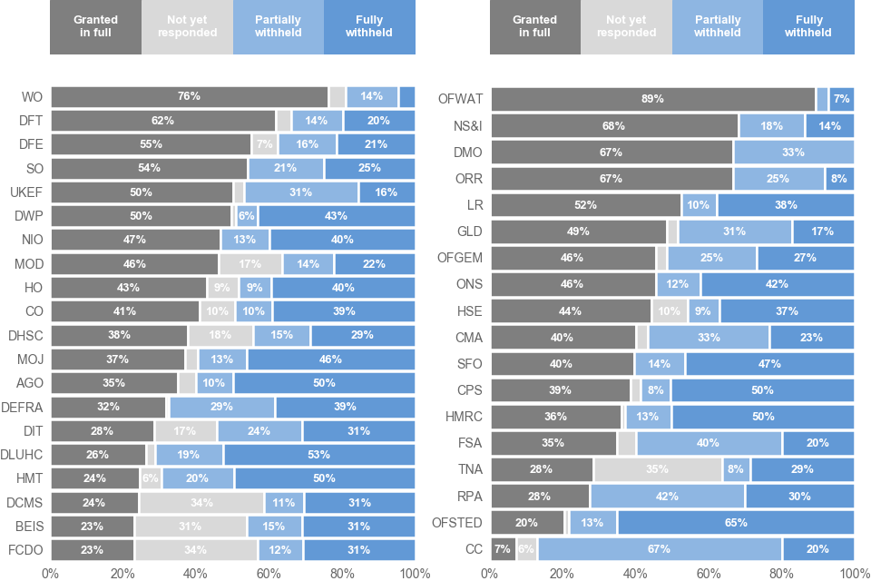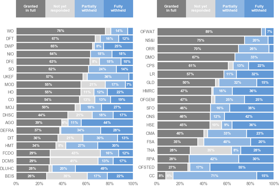 Horizontal stacked bar chart showing outcomes by body - grouped into Granted in full, Not yet responded, Partially withheld, Fully withheld
