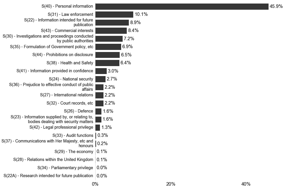 Of the 4,423 requests withheld in full or in part, 27% were withheld due to the cost of response exceeding the statutory limit, 2% as vexatious or repeated, and the remaining 70% concerned exempt information. Of these, Section 40 (covering personal information) was by far the most commonly cited, as in previous quarters.