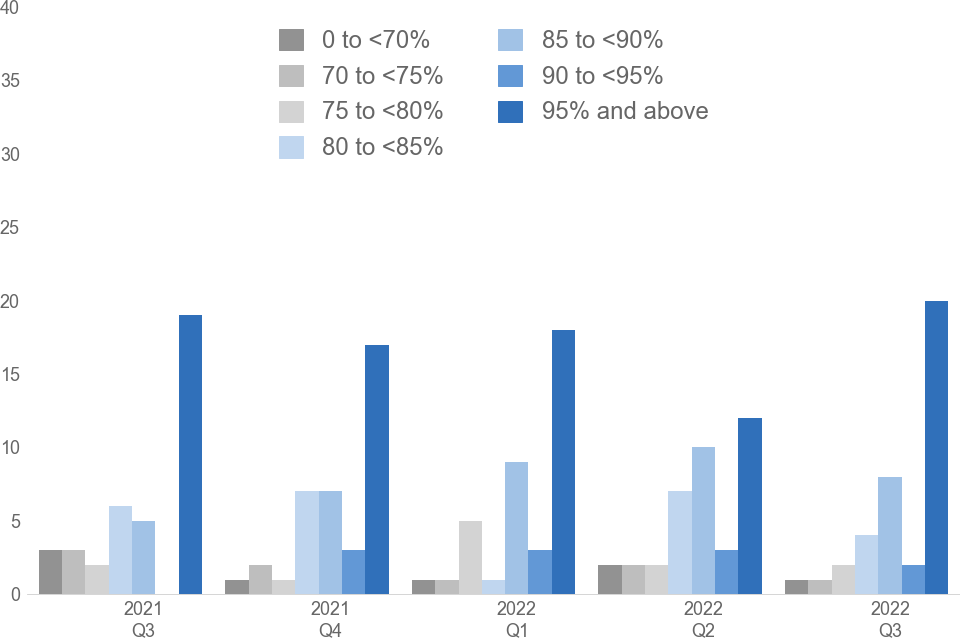 Figure 1.2: Number of monitored bodies by their percentage of responses to requests in time since Q3 2021 (see Worksheet 4 of data tables)