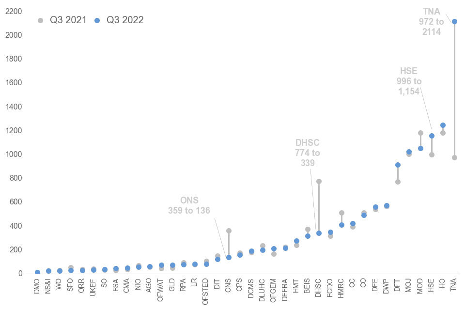 The National Archives had the largest increase in requests (+1,142) amongst all monitored bodies compared to the same period in 2021, followed by the Health and Safety Executive (+158). The Department for Health and Social Care had the largest decrease in number of requests (-435) followed by the Office for National Statistics (-223).