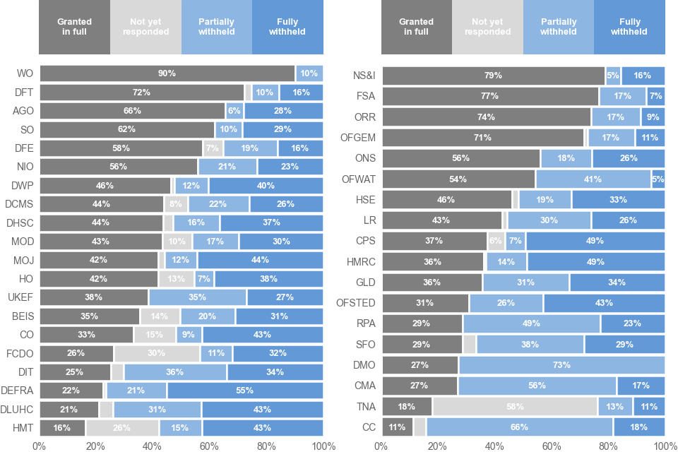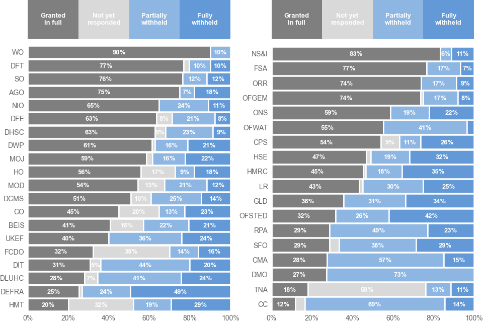Horizontal stacked bar chart showing outcomes by body - grouped into Granted in full, Not yet responded, Partially withheld, Fully withheld