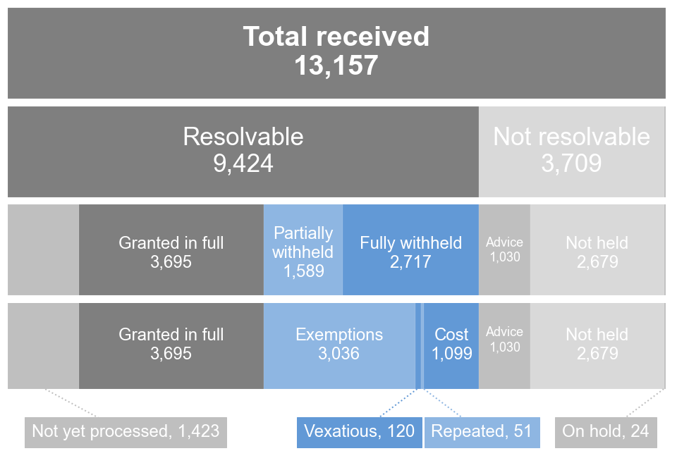 13,157 “non-routine”* requests were received in July to September 2022. Of these 9,424 (72%) were resolvable. Resolvable requests are those where it was possible to give a substantive decision on whether to release the requested information. Of these: