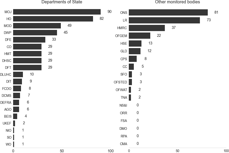 The Home Office, the Ministry of Defence, the Ministry of Justice, and the Department for Transport accounted for more than half (53%) of requests to Departments of State; whilst the National Archives and the Health and Safety Executive accounted for 64% of requests to other monitored bodies.