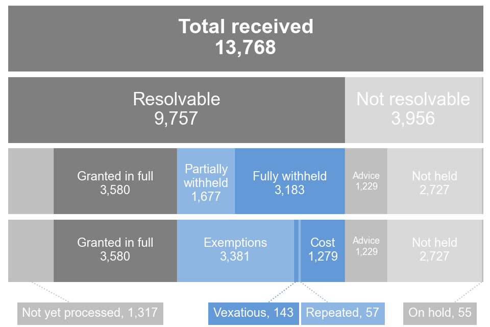 13,768 “non-routine”* requests were received in October to December 2022. Of these 9,757 (71%) were resolvable. Resolvable requests are those where it was possible to give a substantive decision on whether to release the requested information. Of these: