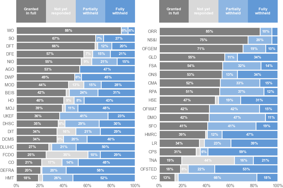 Horizontal stacked bar chart showing outcomes by body excluding procedural refusals - grouped into Granted in full, Not yet responded, Partially withheld, Fully withheld