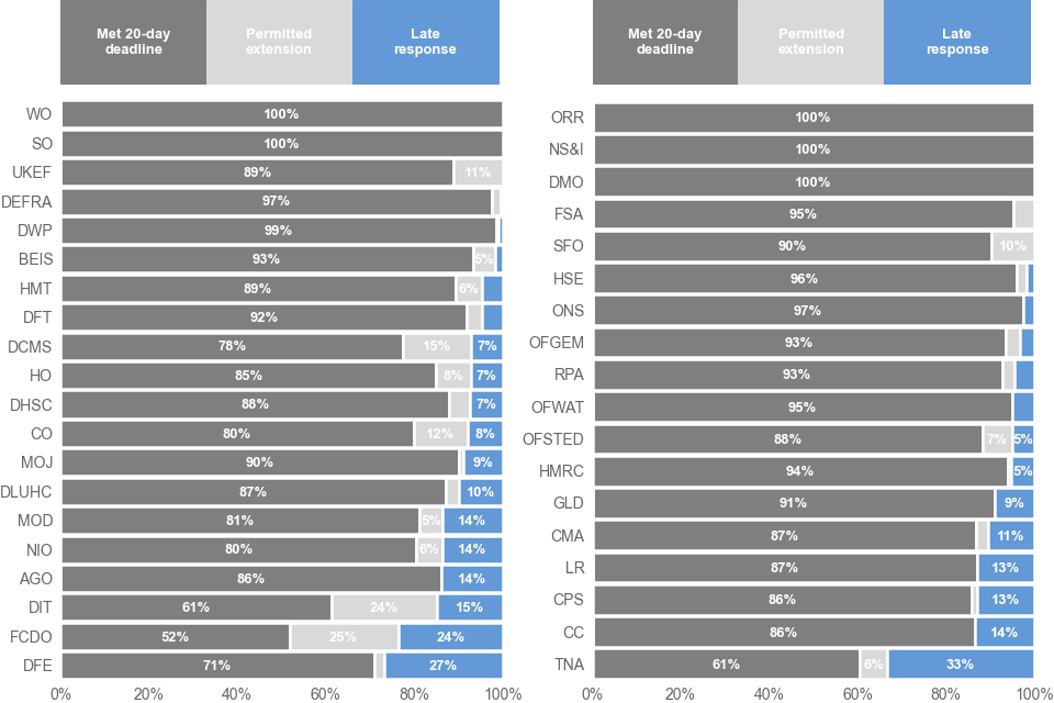 Horizontal stacked bar chart showing timeliness of response by body - grouped into Met 20 day deadline, Permitted extension and Late response