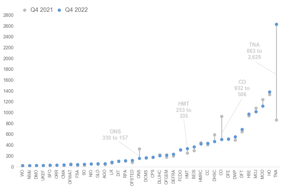 Chart comparing volume of FOI requests received by body in Q4 2021 to Q4 2022