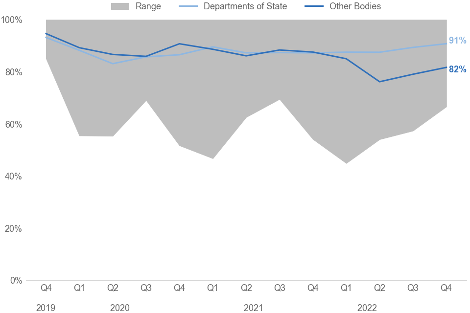 Across all Departments of State, 91% of requests were responded to in time, up from 87% in Q4 2021.