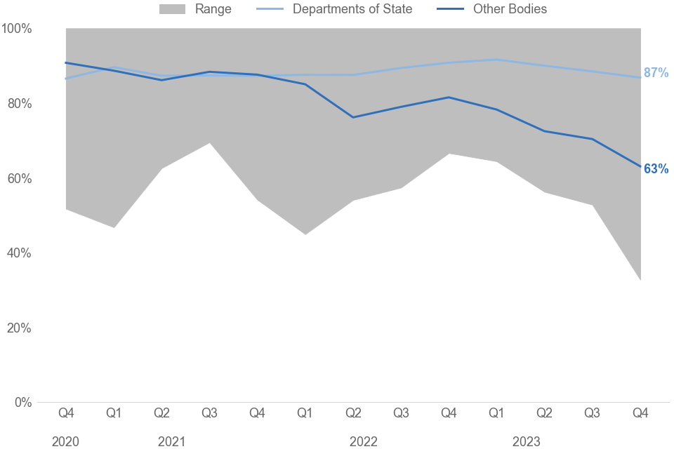 Across all Departments of State, 87% of requests were responded to in time, down from 91% in Q4 2022.