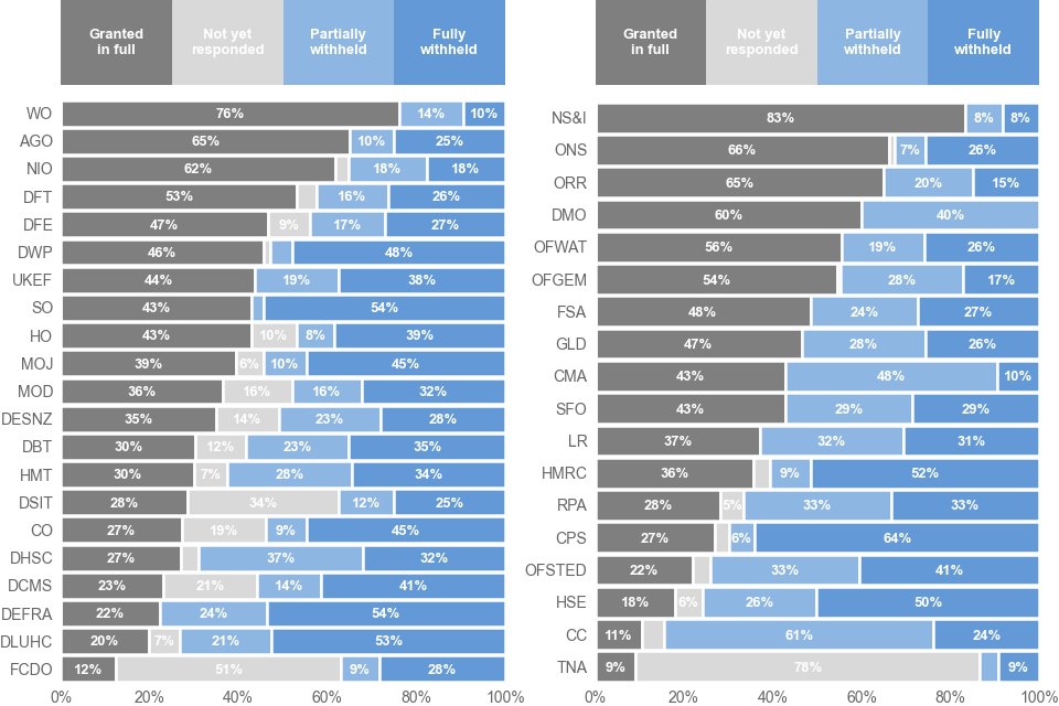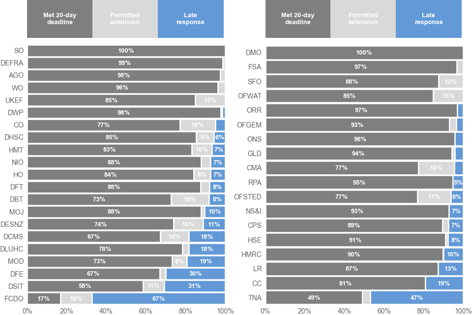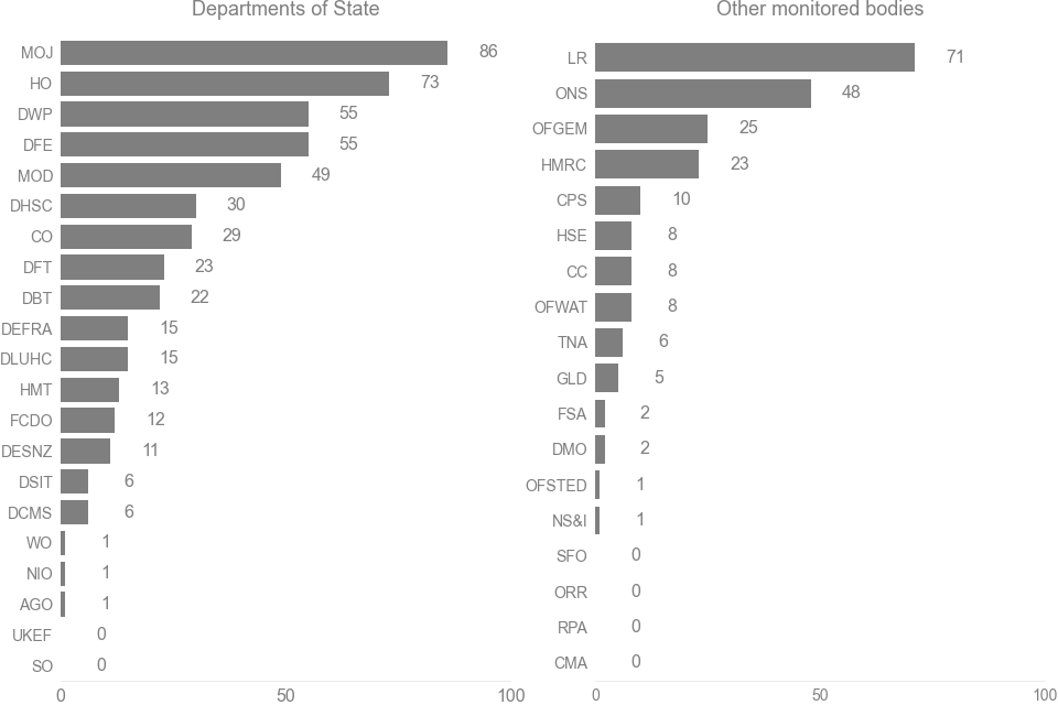 The Home Office, the Ministry of Defence, the Ministry of Justice, and the Department for Transport accounted for more than half (53%) of requests to Departments of State; whilst The National Archives alone accounted for 75% of requests to other monitored bodies.
