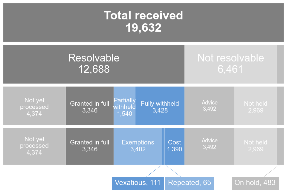 19,632 “non-routine”* requests were received in October to December 2023. Of these 12,688 (65%) were resolvable. Resolvable requests are those where it was possible to give a substantive decision on whether to release the requested information. Of these: