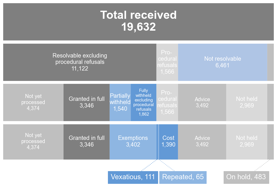FOI requests that have been refused for being vexatious or repeated, along with those refused on cost grounds are treated and included in these statistics as resolvable requests that have been ‘fully-withheld’. These types of refusals are referred to as ‘procedural refusals’ in these statistics.