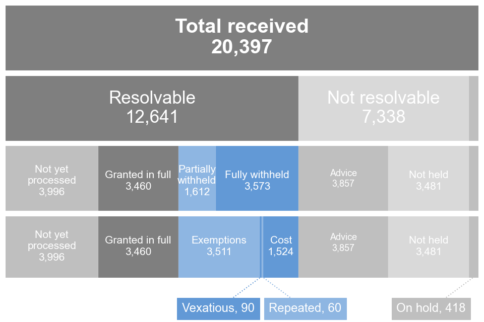 FOI requests that have been refused for being vexatious or repeated, along with those refused on cost grounds are treated and included in these statistics as resolvable requests that have been ‘fully-withheld’. These types of refusals are referred to as ‘procedural refusals’ in these statistics.